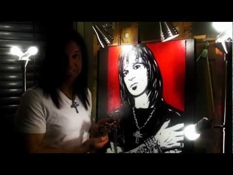 She generally paints portraits on 4' by 4' canvas, but has also painted images on guitars, like one made of Elvis and on smaller canvases.