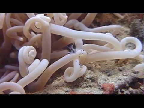 Ancylomenes longicarpus (also known as long-arm cleaner shrimp or anemone partner shrimp) is a species of shrimp found from Red Sea to Western Pacific. It's tiny (length up to 2.5 cm) body is transparent with white and purple spots on tail and white line between eyes. It's often associated with corals from geniuses Xenia, Plerogyra and anemones Entacmaea quadricolor, Heteractis crispa.