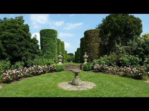 At the southwest end of the Furlong Drive is the Sundial Circle, which contains a sundial surrounded by a lawn and borders of shrub-roses and other flowering shrubs. From the Sundial Circle a path leads into an area known as the Rootree. This was created in the 19th century as an alpine rock garden but since 1960 it has been planted with flowering shrubs. From the Rootery paths lead to the Fish Garden, a small sunken garden containing a pond, and to the Rough, a semi-wild area. From the north end of the Ilex Avenue a gate leads into the Walled Garden. This was formerly one of the kitchen gardens and was redesigned in 1960. It contains a pond surrounded by statues of four heraldic beasts which were originally on the roof of the house. In the centre of the pond is a modern flower sculpture designed by Tom Leaper. This garden also contains lawns, trees and shrubs. To its east is the Kitchen Garden, where vegetables as well as flowers and crab apples are grown. To the east of the Kitchen Garden are two small gardens, the Herb Garden and the Scented Garden, the former containing herbs and the latter strongly scented flowers and shrubs.