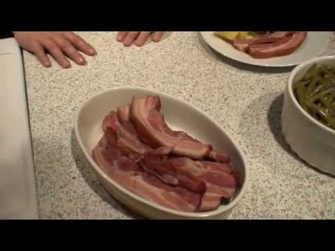 According to taste, the bacon is placed either in complete strips or cut up into water which is then brought to the boil. Meanwhile, the beans are cleaned, washed and cut into sections. After 25 minutes of cooking, the beans are added together with the savory to the bacon and cooking continues. The flowers are removed from the pears, but the stalks are left on. The pears are left with their skins on throughout. They are then laid on the beans and everything is cooked together.