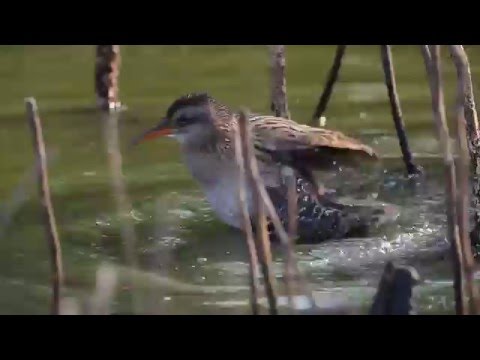 The call is quite different from that of the water rail. The courtship call, again given throughout the year, is a sharp piping kyu, longer and clearer than that of the European race. The song is a series of metallic slurred shrink, shrink notes, about two per second, and repeated after a short pause. The eastern race does not respond to recorded announcement calls of nominate R. a. aquaticus.