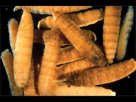 The primary screwworm, C. hominivorax, is a parasitic species, whose larvae are renowned for eating and infesting the flesh of living organisms, primarily warm-blooded animals such as cattle and other livestock. Their larvae cause myiasis, or an infestation of maggots, in lesions or other wounds and injuries that the host animal may have. Fly strikes may occur due to such farming processes as branding, castrating, dehorning, and tailing of the host animals. These processes, along with barbed-wire cuts and flea bites, lead to myiasis in the host animal. Navels of newborns also can be the sites of infestation. C. hominivorax tends to reproduce only on the flesh of a living host. Unlike most other maggots, these maggots attack and consume healthy living tissue along with decaying tissue (hominivorax literally translates to “man-eating”). The larvae are responsible for their common name, the screwworm, because they possess small spines on each body segment that resemble a screw’s threads. After the larvae hatch, they dive into the wound and burrow deeper, perpendicular to the skin surface, eating into live flesh, again resembling a screw being driven into an object. The larvae then continue to feed on the wound fluids and the animal’s tissue.
