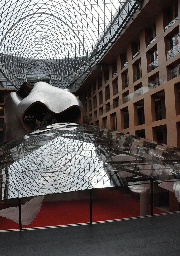 The building is mixed-use. Facing the Brandenburg Gate are offices, the headquarters of Deutsche Zentral-Genossenschaftsbank. On the other side, facing Behrenstraße, are 39 residential apartments. Between the two is a large atrium, designed to be used as a conference or performance space. This is covered with a sophisticated glass-grid roof, curved in a complex form typical of Gehry's designs.