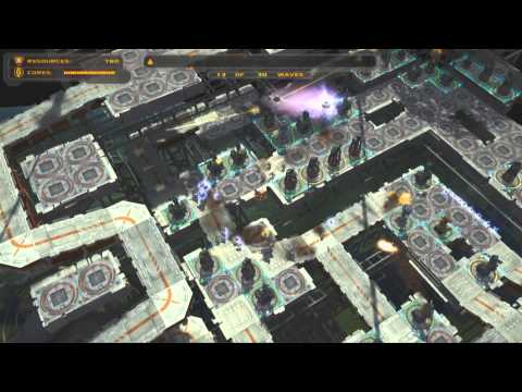 Good tower placement is the key strategic object of the game. Each tower has unique trade-offs that affect ideal placement, such as line-of-sight or ballistic trajectory fire; a large area of effect or damage over time; and minimum and maximum ranges. The "insectoid" enemies arrive in waves and travel along elevated pathways which connect various structures found at the bases. Killing enemies earns resources, which can be used to build more towers and upgrade towers toward two stronger levels. Depending on the tower type an upgrade will provide a more powerful attack, an increased rate of fire and increased range. Tower strength is denoted by the colours green, yellow and red. Towers may be sold (removed) if resources are needed or a player wants to alter pathways. Resources earn interest with the rate increasing the more resources are obtained. The tower defenses are supplemented by the use of an orbital laser which completely destroys all aliens in its blast zone in one strike. The laser is not available in early missions and takes time to recharge. No resources are earned from enemies destroyed by the orbital laser.