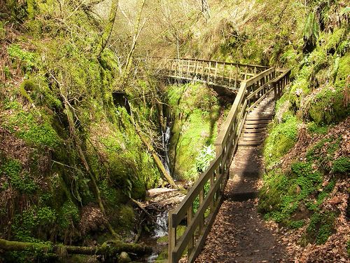 The glen has many plants, a stream and several small waterfalls.