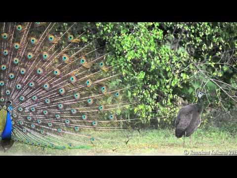 Peacocks are polygamous, and the breeding season is spread out but appears to be dependent on the rains. Peafowls usually reach sexual maturity at the age of 2 to 3 years old. Several males may congregate at a lek site and these males are often closely related. Males at lek appear to maintain small territories next to each other and they allow females to visit them and make no attempt to guard harems. Females do not appear to favour specific males. The males display in courtship by raising the upper-tail coverts into an arched fan. The wings are held half open and drooped and it periodically vibrates the long feathers producing a ruffling sound. The cock faces the hen initially and struts and prances around and sometimes turns around to display the tail. Males may also freeze over food to invite a female in a form of courtship feeding. Males may display even in the absence of females. When a male is displaying, females do not appear to show any interest and usually continue their foraging. The peak season in southern India is April to May, January to March in Sri Lanka and June in northern India. The nest is a shallow scrape in the ground lined with leaves, sticks and other debris. Nests are sometimes placed on buildings and in earlier times have been recorded using the disused nest platforms of the white-rumped vultures. The clutch consists of 4–8 fawn to buff white eggs which are incubated only by the female. The eggs take about 28 days to hatch. The chicks are nidifugous and follow the mother around after hatching. Downy young may sometimes climb on their mothers' back and the female may carry them in flight to a safe tree branch. An unusual instance of a male incubating a clutch of eggs has been reported.