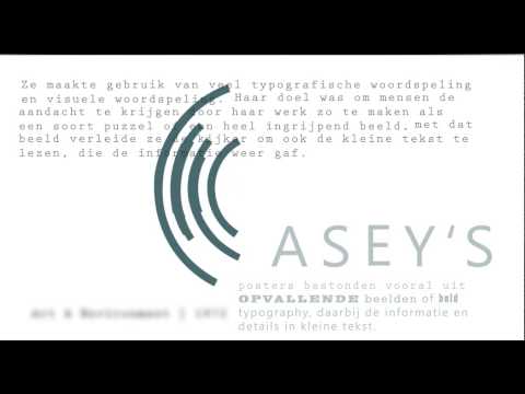 Casey's posters generally consisted of a striking image or bold typography, accompanied by informational details in small text. She often used typographic wordplay and visual puns in her work. Speaking of her designs in 1988, she said: "My job is to stop anyone I can with an arresting or puzzling image, and entice the viewer to read the message in small type and above all to attend the exhibition."