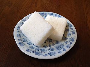 Karukan is made from karukan rice flour powder, sugar, and grated Japanese yam. Water is added to the blended ingredients and the mixture is then kneaded and steamed. It is like an elastic white sponge.