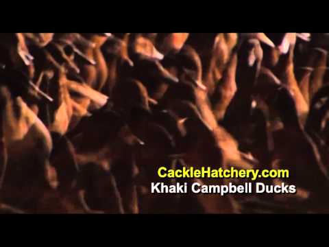 Adult Campbell ducks weigh approximately 3-5 pounds. Campbells can come in three color varieties: khaki, dark and white. They are a cross between Mallard, Rouen and Runner ducks. The Khaki Campbell drake is mostly khaki colored with a darker head usually olive green lacking the white ring of its Mallard ancestors. The Khaki Campbell duck has a more modest plumage of Khaki covering the entirety of the body. Despite popular misconceptions of skittish or flightly behavior Campbells are a very gentle, passive and friendly breed when raised by hand until maturity. They are a good breed for young families and children to raise.