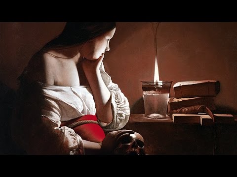 This painting and the Mirror one mentioned above, seem to have been inspired by several themes popular with Italian and Dutch artists: the repentant Magdalene, Melancholy, and Vanity. The artist has given it a feeling of philosophical meditation in keeping with the spirit of the time; the subject's body is enveloped in mysterious darkness, and her face illumined only by the candle. On her knees a skull (for the Golgotha), on the table some books and a candle, and, on a wooden cross, a blood-stained scourge.