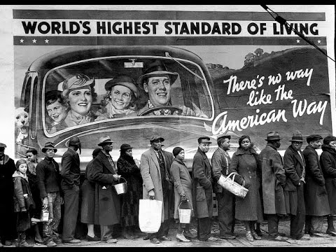 During the mid-1930s, Bourke-White, like Dorothea Lange, photographed drought victims of the Dust Bowl. In the February 15, 1937 issue of Life magazine, her famous photograph of black flood victims standing in front of a sign which declared, "World's Highest Standard of Living", showing a white family, was published. The photograph later would become the basis for the artwork of Curtis Mayfield's 1975 album, There's No Place Like America Today.