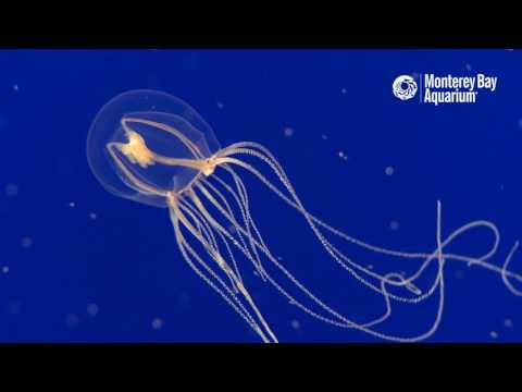 Polyorchis or Bell Jellies are not a true jelly but actually a hydromedusae, or hydrozoans like Velella and Portuguese Man-of-War. They are transparent with red coloration in their internal organs and eyespots around the rim of their bell. The red pigmentation helps them camouflage. They are often found in harbors, marinas, and other calm waters close to shore. They feed on plankton and benthic crustaceans and are found near the sea floor. Bell jellies bells can reach about 2.25 inches (5cm).