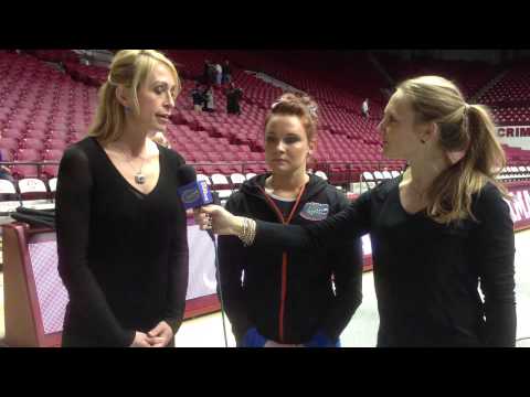 Florida coach rhonda faehn sophomore bridget sloan with ashley kerr following alabama meet 2 28 14