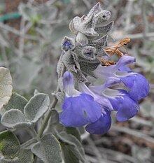 It is found growing along dry riverbeds and canyons in rocky soil. In the wild it grows 60 cm (24 in) tall and wide, with small felt-like leaves that are whitish-grey and 2.5 cm (0.98 in). The flowers are violet-blue, with a pearly grey calyx and light violet around the edges.