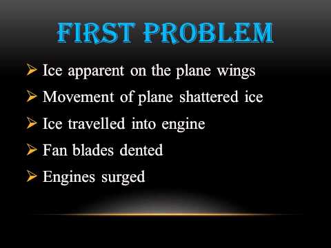 At and shortly after liftoff, pieces of ice slammed onto the fans of both engines, deforming the fan blades sufficiently to disturb the airflow to the compressors. The disturbed airflow caused the compressors to stall and this in turn caused the engines to surge. Because the engines were not throttled down sufficiently, the surges continued. The high loads from repeated engine surges quickly led to the breakup of both engines.