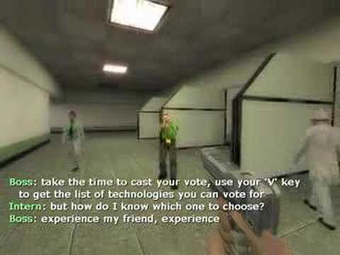 Players spawn in the "Cloning Facilities" of their company, where they can find weapons and ammo crates, as well as health and armor chargers. At the start of the game, the only weapons available are a briefcase and a pistol, but this arsenal grows bigger as new weapons are researched by the scientists. Players decide which technology to research next by voting for it. The available technologies are divided in 5 branches: Weapons, Armor, Implants, Devices and Process Upgrades.