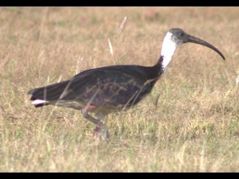 Straw-necked ibises are large birds, around 60–75 cm (23.5–29.5 in) long. They have dark wings that show an iridescent, multicoloured sheen in sunlight, and have a dark back and collar. Most of the neck is white, as are the underparts and undertail. They have a long, black, downcurved bill, and their legs are usually red near the top and dark grey toward the feet. Straw-like feathers on the neck of adults give the bird its common name.