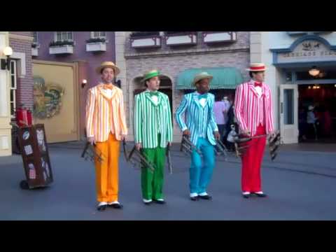 Visitors can be serenaded by the Dans at the Magic Kingdom in Florida while having their hair cut in a real, working barbershop on Main Street there. The Dans at Hong Kong Disneyland stroll up and down Main Street from Town Square. The Dans at Disneyland can be seen on their Schwinn custom four-seater bicycle (commissioned by Walt Disney himself) and in various locations around Main Street.