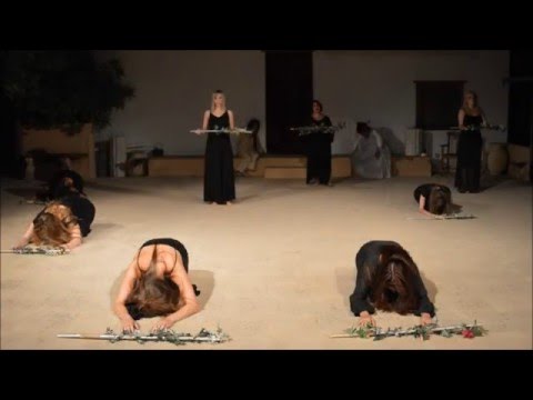 Aethra, the mother of the Athenian king Theseus, prays before the altar of Demeter and Persephone in Eleusis. She is surrounded by women from Argos whose sons died in battle outside the gates of Thebes. Because of Creon’s decree, their corpses remain unburied. Adrastus, the king of Argos who authorized the expedition, lies weeping on the floor surrounded by the sons of the slain warriors. Aethra has sent a messenger to Theseus asking him to come to Eleusis.