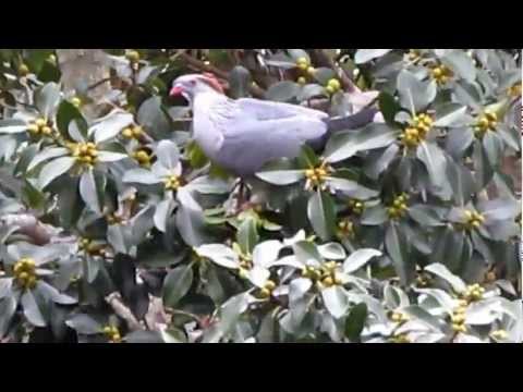 The topknot pigeon is a large predominately slate-grey bird, measuring between 40 and 46 centimetres in length. The back, coverts and upper secondaries are a darker slate-grey with black quills. The primaries are black, the remaining body in a lighter slate-grey in colour. The chest and hind neck are notched, showing dark bases giving a streaked appearance [2] , The tail is black crossed with a board grey band. The crest is grey from the cere to the forehead, and russet brown on the crown with black sides. The mandibles are red with a brown tip, the protuberances at the base of the mandibles are bluish-green. The tarsals and feet are purplish red. The sexes are similar in description. However, Males have larger crest and lack some of the streaking on the chest. Juveniles are like females but the chest is mottled not streaked, the crest is smaller, with the cere and forehead being light brown, the crown grey. Tarsals and feet are reddish brown. The iris is yellow-golden with a bright red outer band. In Fledglings the iris is brown.[2}
