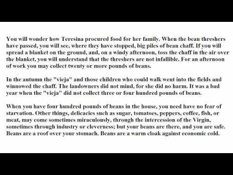 13 How Danny's friends threw themselves to the aid of a distressed lady. — The unmarried Teresina Cortez has a menagerie of nine healthy babies and children, who all live on nothing but tortillas and beans, but nevertheless are found amazingly healthy by the school doctor. Teresina gleans the beans from the fields. As the Madonna of the tale, Teresina produces the droves of babies with seemingly no particular help. When the bean crop is ruined by rain, Danny's housemates steal food all over Monterey for the children. It makes them sick. However, the arrival of some stolen sacks of beans at the door is deemed a miracle, the children regain their health, and Teresina is also pregnant again. She wonders which one of Danny's friends was responsible.