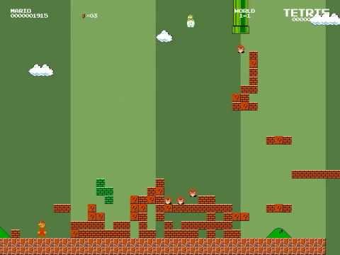 The game starts out with normal Super Mario Bros. 2D platformer gameplay. After a short while however, the player is granted the ability to control Tetrimino blocks across the field of play. The falling blocks, that fall from a Lakitu, can be stacked and become platforms which the player can use to make Mario cross large gaps or reach higher terrain. Pressing the spacebar will change between modes, either controlling Mario or controlling the falling blocks. The screen moves automatically forward to the right, and the player cannot go backwards.