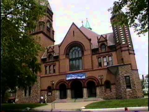 The great tower, over one hundred and sixty-five feet high, of sparkling granite and carved limestone, is a landmark for many miles. There are one hundred eighty granite steps leading to the tower. In this tower is a finely adjusted D Chime of eleven bells. They weigh a total of 14,000 pounds and are played (struck) by iron hammers. The bells were cast by Chester Meneelly of the Meneelly Bell Company of Troy, New York. The original ringer’s gallery is still in the tower even though the bells are now played both by hand or electronically from a small room in the sanctuary.