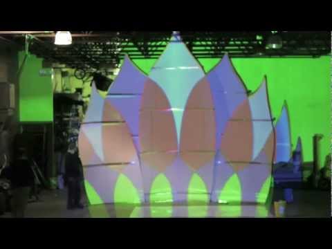 The Shpongletron, designed by Zebbler for Shpongle's 2011 US Tour, consists of a DJ booth for Shpongle, surrounded by custom screens and surfaces that have video mapped images projected onto them. On the bottom of the audiovisual installation, also dubbed "The Shpongletron Experience", are three white painted scaffolding cubes that are covered by translucent screen. The six foot Shpongle Mask is also a 3-D projection surface, along with wings and an eye that are both covered in projection material. The custom welded eye also has an embedded laser. In 2014, Zebbler designed the critically acclaimed Shpongletron 3, which embedded the new touring structure with pixel mapped LEDs and infinity mirrors.