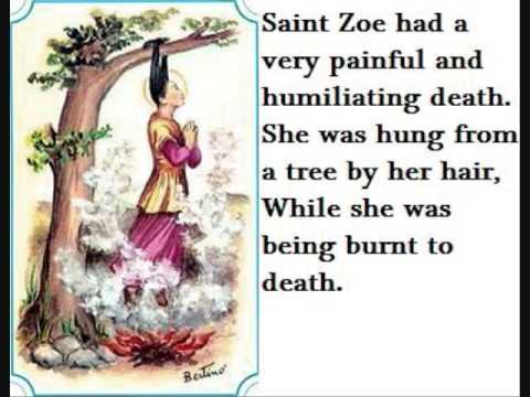 Saint Zoe of Rome (d. ca. 286 AD) was a noblewoman, married to Nicostratus, a high Roman court official. For six years she had been unable to speak. St Sebastian made the Sign of the Cross over the woman, and she immediately began to speak and she glorified the Lord. Nicostratus and his wife asked for Baptism. She lived during Emperor Diocletian's early persecution of the Christian Church.